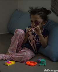 Buthaina — the five-year-old girl pictured here — was pulled from the rubble of her family home in Yemen’s capital. Badly bruised, she struggled to pry open a swollen eye with her fingers, to look at a world that dealt her such cruelty.