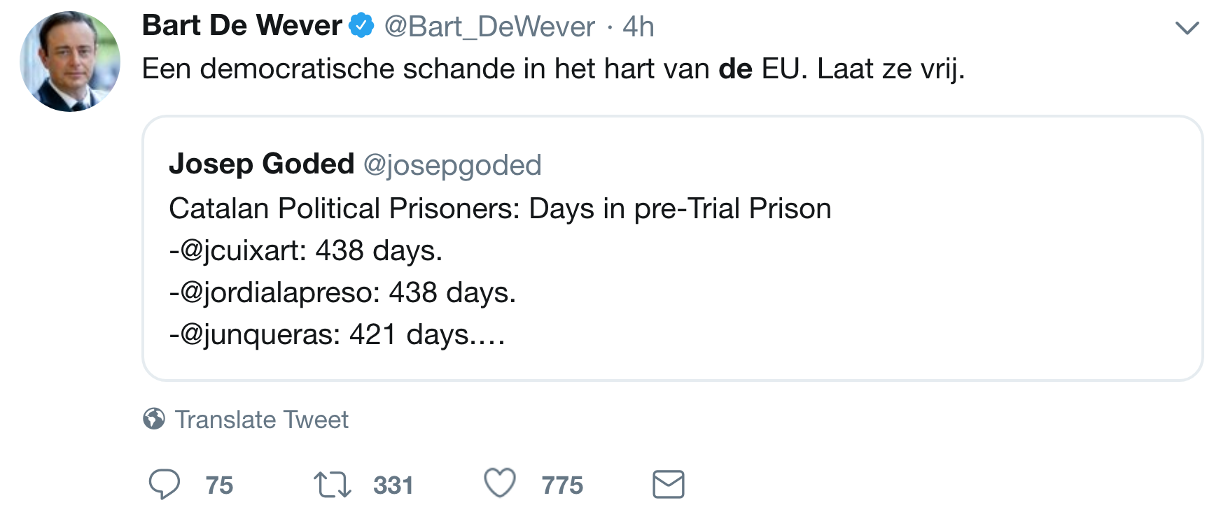 "Totaal buiten proportie. Ik erger me meer dan ooit aan het stilzwijgen van Europa. Wat in Spanje gebeurt, is enorm: zeven verkozen parlementsleden onder wie een parlementsvoorzitter zitten al een jaar in voorhechtenis en dreigen voor vele jaren achter de tralies te blijven. En niemand die zijn mond opendoet. Ook bij onze politici is de stilte oorverdovend. Bij de Franstaligen over de hele lijn, maar ook de Vlaamse progressieven en christendemocraten zwijgen in alle talen." (Paul Bekaert, de advocaat van Carles Puigdemont, in Knack)