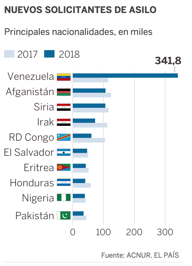 Het aantal vluchtelingen (mensen die hun land verlieten, eerder dan elders in eigen land een veiliger onderkomen te zoeken) werd de hoogte ingejaagd door de 341.800 asielaanvragen die door Venezolanen werden gedaan. 90% van de Venezolanen die in Europa aankomen, vragen asiel aan in Spanje. Dan zijn er nog de Zuid-Soedanezen die naar Soedan en Oeganda vluchten.