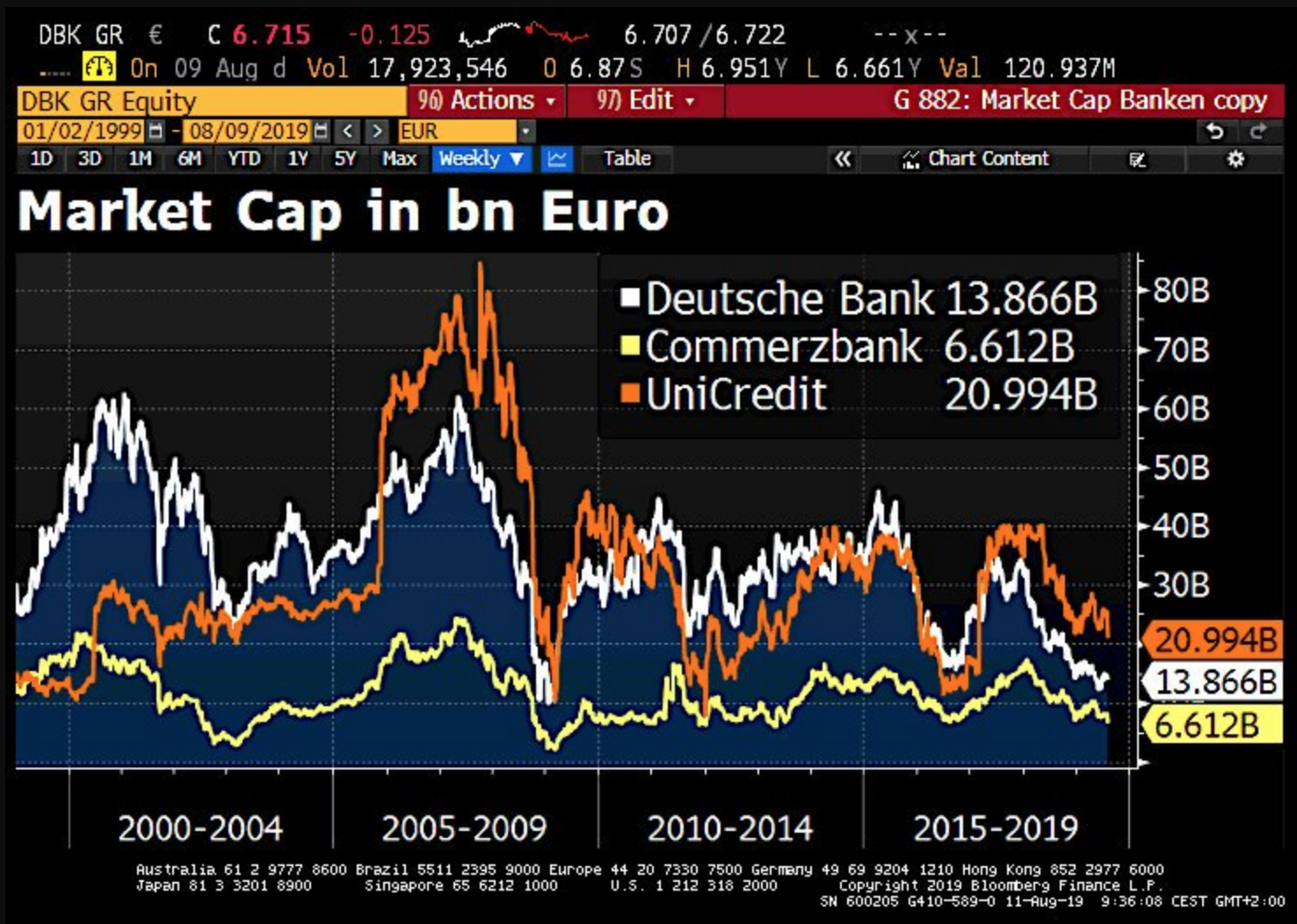 [De dodelijke spiraal waarin de Europese banken zich bevinden wordt best geïllustreerd door de immer krimpende beurskapitalisatie van haar grootbanken. Het Italiaanse UniCredit is nog 21 miljard euro waard, de Duitse Commerzbank 6 miljard euro en de Deutsche Bank 13,8 miljard euro.