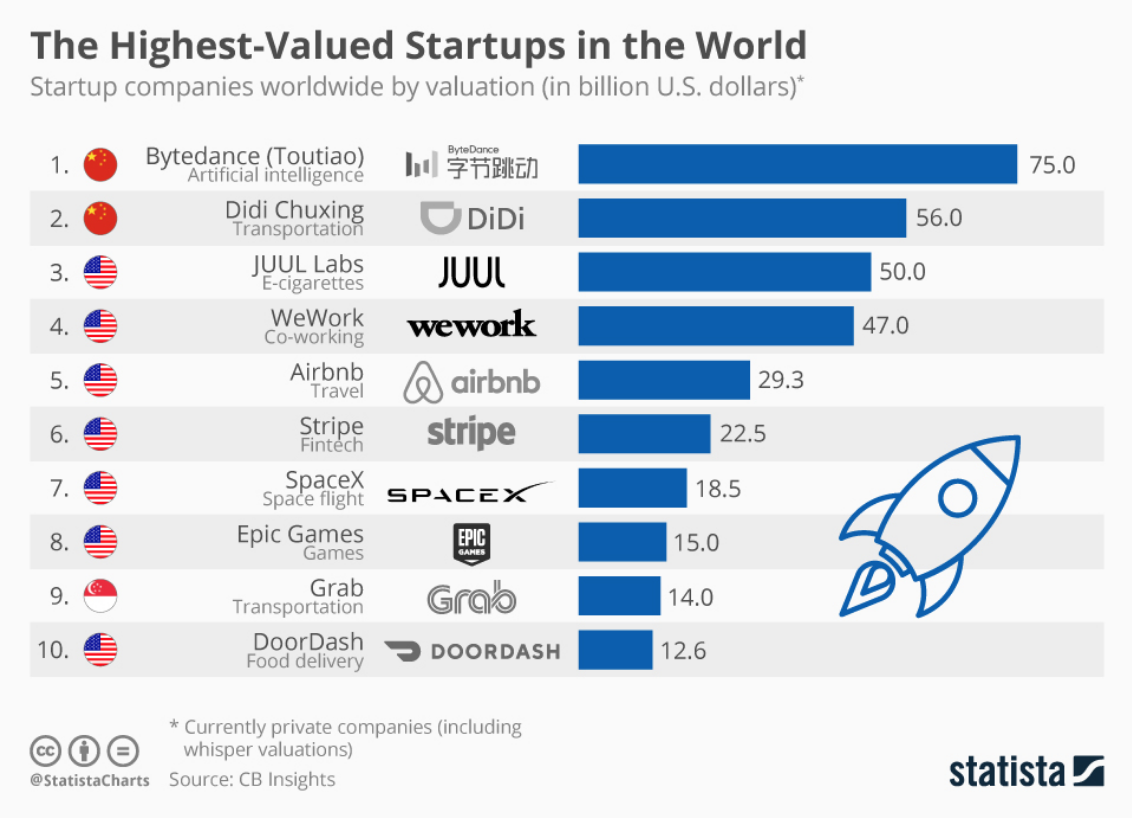 [In de grafiek is te zien dat de EU uitblinkt in afwezigheid in de top 10 met 's werelds hoogst gewaardeerde startups. Erger nog, in de top 20 is exact 1 bedrijf van Europese origine. Global Switch op 14 is een Engels bedrijf, een land dat straks de EU vaarwel zegt.]