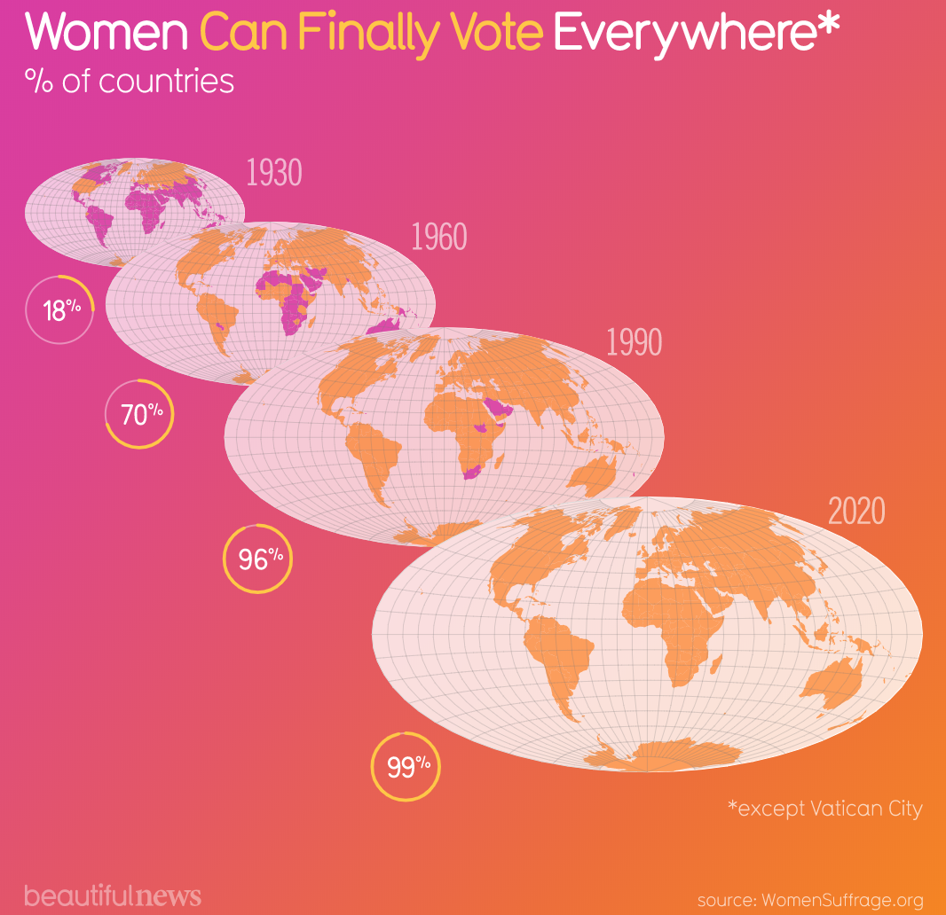 Tussen 1930 en vandaag is het aantal landen waar vrouwen stemrecht hebben gestegen van 18% tot 99%.