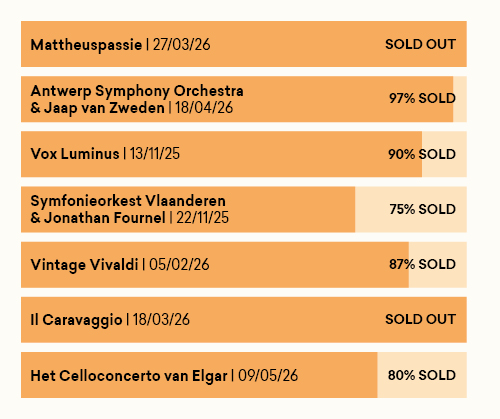 Doorblader ons programma op reeks of op datum. Genoeg pareltjes om uit te kiezen! Wie tickets koopt voor minstens 5 concerten, krijgt nog steeds 20% korting.